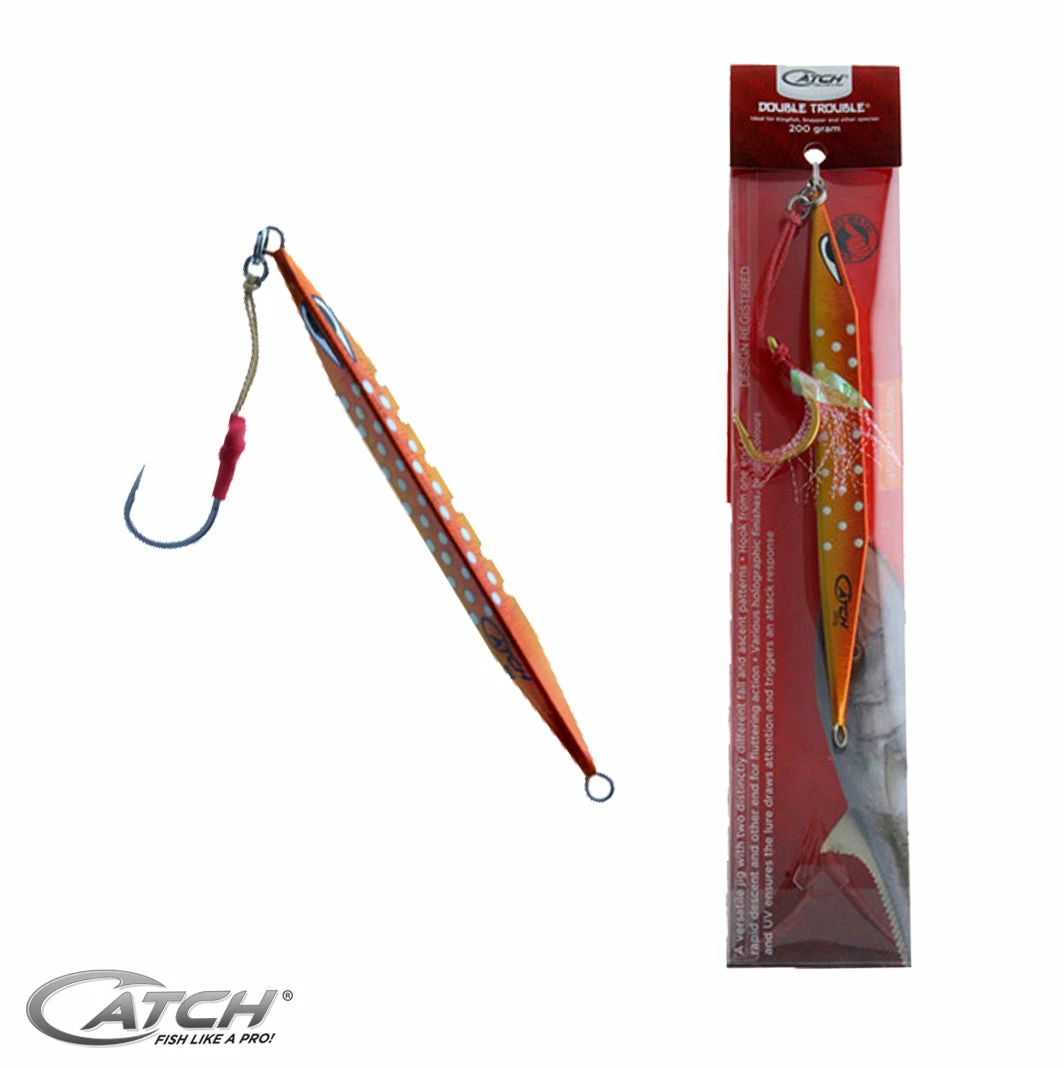 Available in six super colours and 60g, 80g, 100g, 200g and 300gram weights. Can be used for mechanical Kingfish jigging or as a fluttering jig for Snapper and the like making it a two action jig, hence the name Double Trouble.