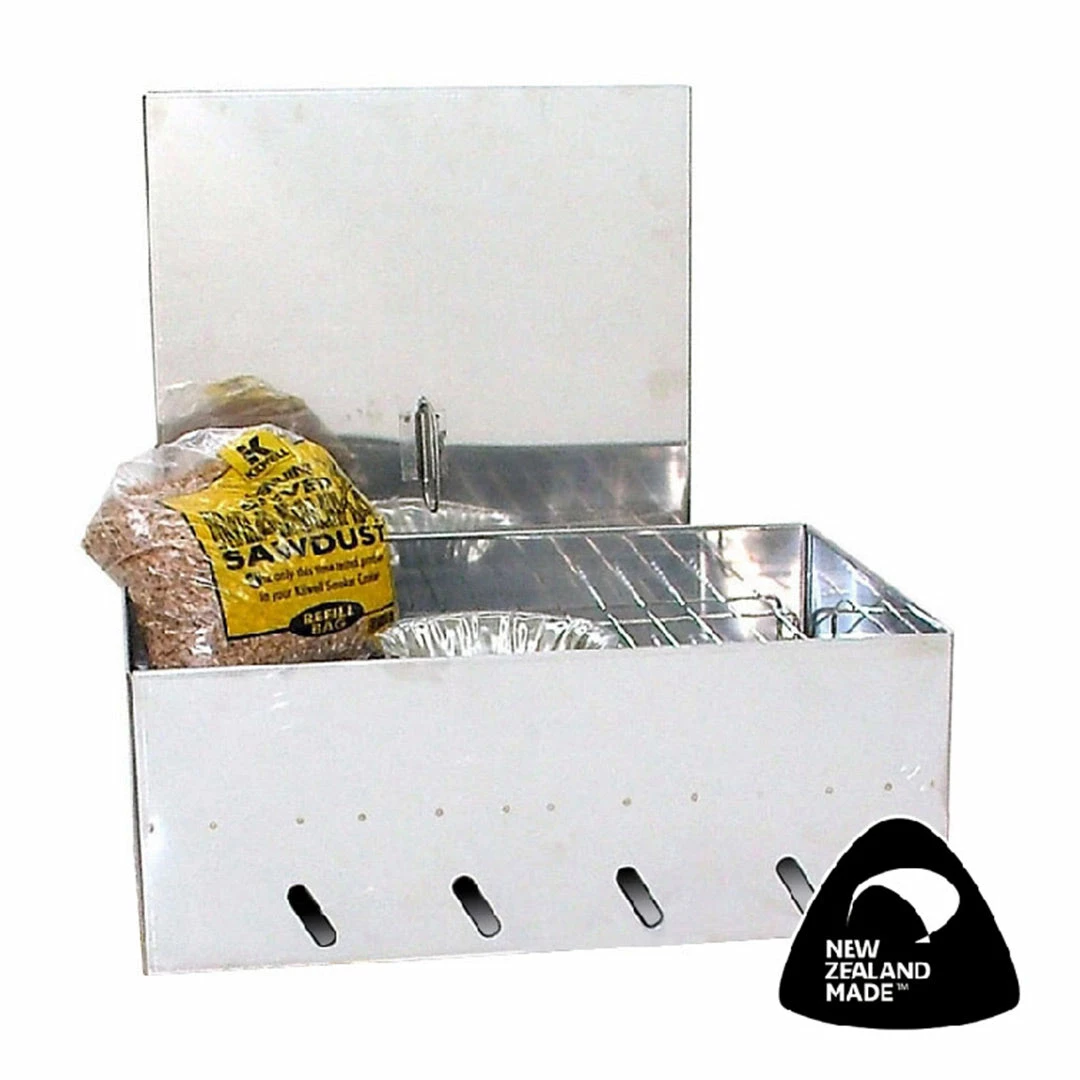 The Midi 10 litre cooker is supplied with one meths burner dish, finely sieved kiln dried Manuka sawdust and a plated steel wire rack.