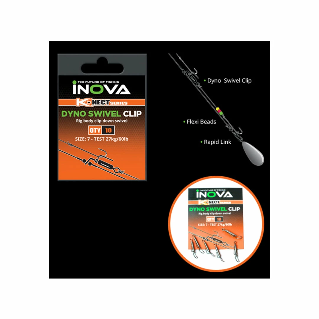 Essential item for surfcasters wanting to uses multiple hooks, the INOVA Dyno Swivel Clip is ideal for using on the body of rigs for clipping down multiple snoods for accurate casting. Releases hook on impact.